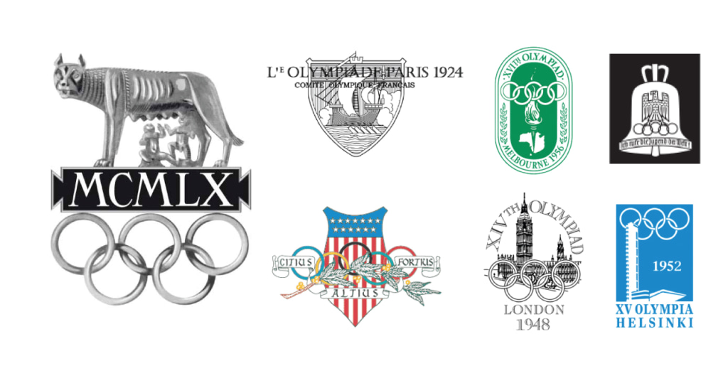 LEFT: Rome 1960‘s she-wolf with the witty Roman numerals stands out from a bunch of bureaucratic logos, and by using grayscale tonality, heralds the age of television. ••• Clockwise, from left: Rome 1960, Paris 1924, Melbourne 1956, Berlin 1936, Helsinki 1952, London 1948 and Los Angeles 1932