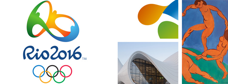 Clockwise, from left: Rio 2016 logo by Brazilian agency Tatil; detail of Telko logo, showing 3D themes then in vogue; Dance, Henri Matisse, a possible inspiration; Heydar Aliyev Centre, by Zaha Hadid, Azerbaijan 2012.