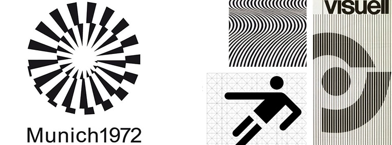 Munich 1972 may have been designed in the late 1960s, when psychedelic and Op-Art themes were rampant. Clockwise from left: Munich 1972 logo, Otl Eicher; a detail from Current, Bridget Riley; detail from brochure, Herbert W Kapitzki; detail from Olympic Manual.