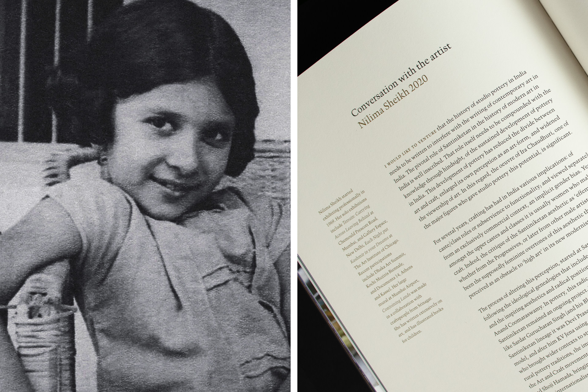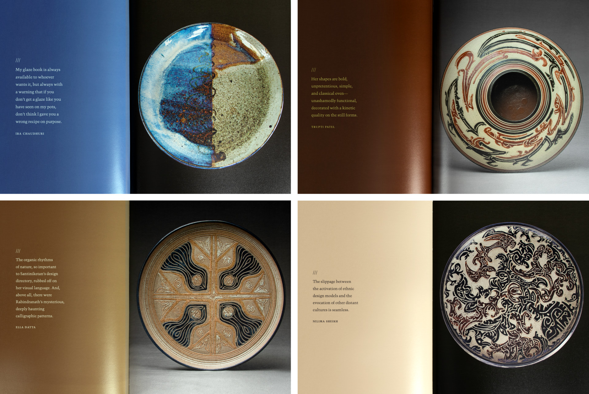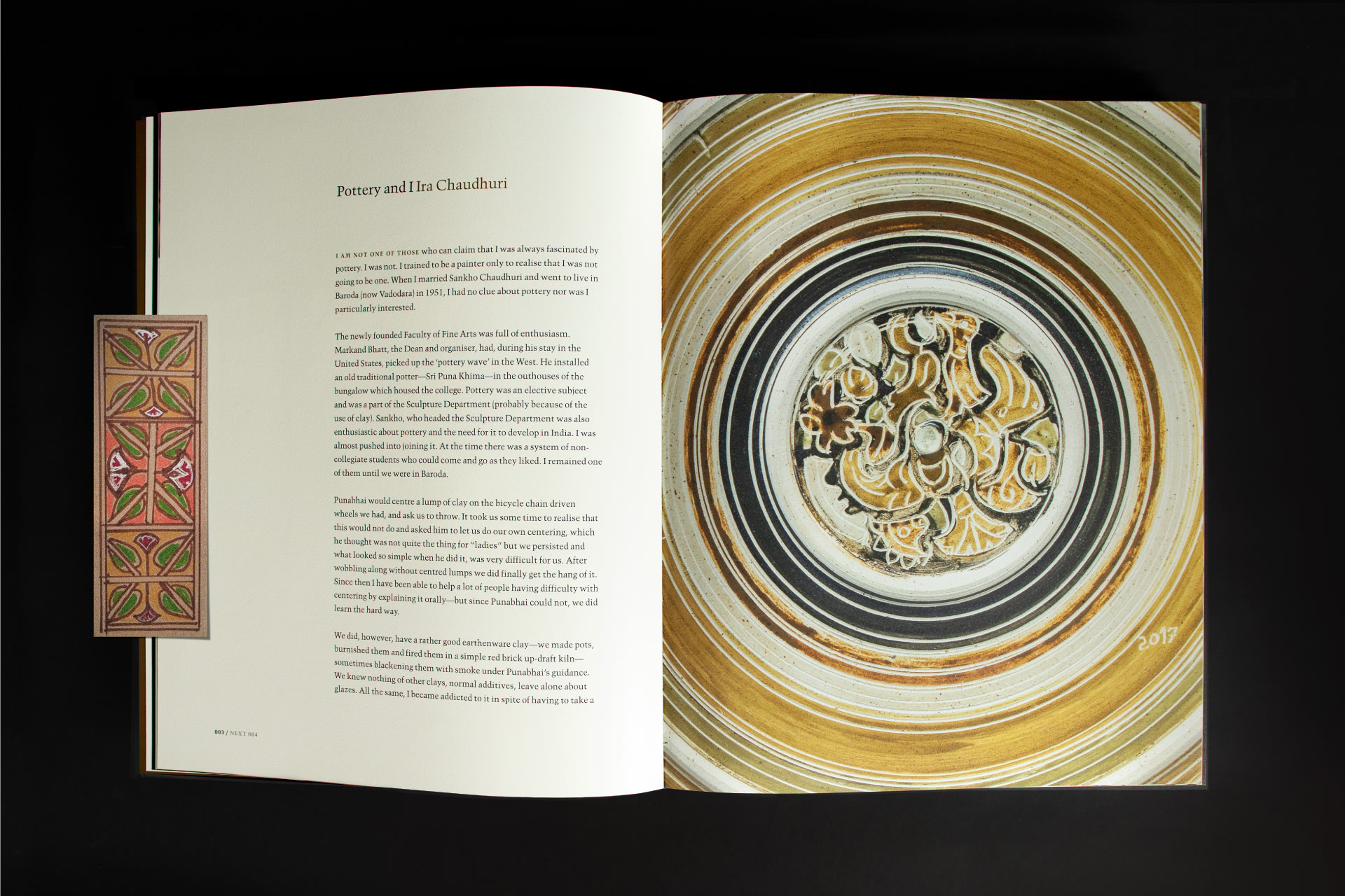 Ira Chaudhuri’s career traces its roots to Shantiniketan where the seeds of Indian ceramic art were laid. From there, her time in Baroda and in Delhi progressed in parallel with the development and maturation of the ceramic and studio pottery movement in India. Hence, the design treats the subject with sensitivity and rigour.