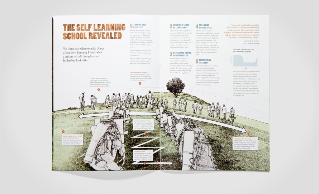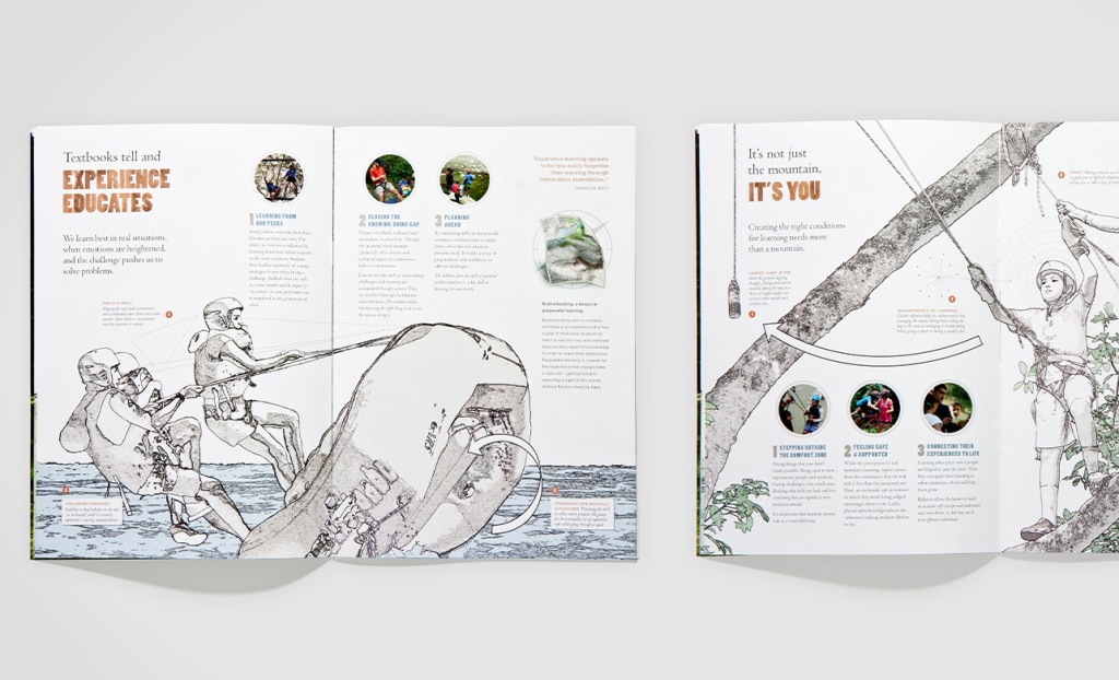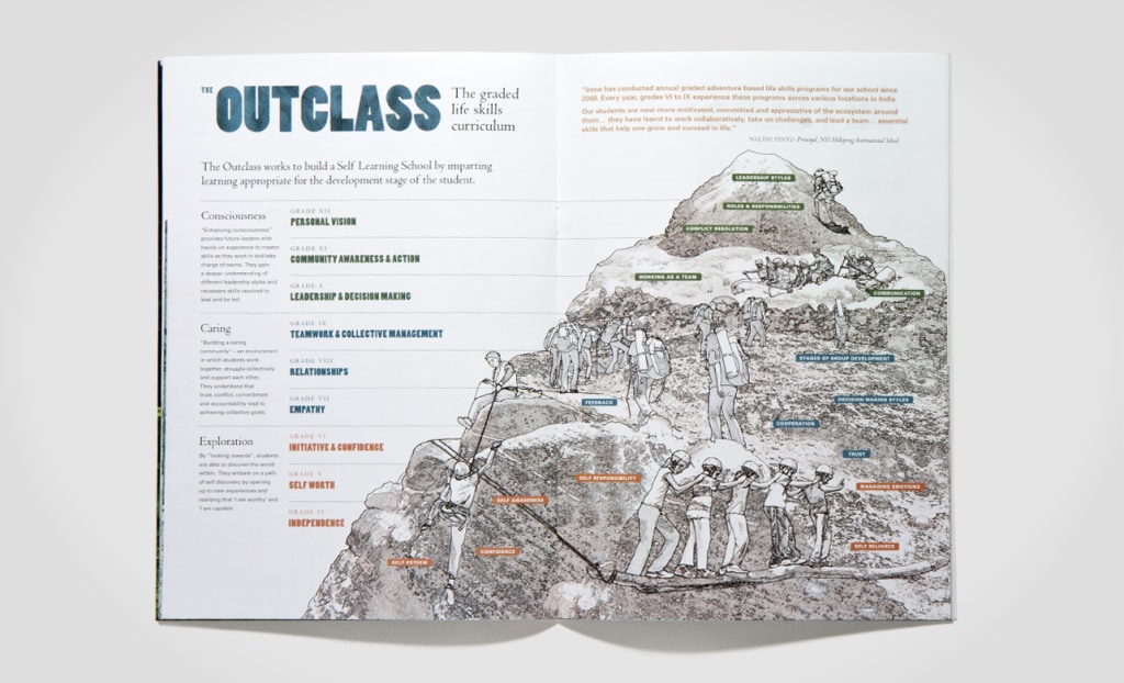 The brochure content and style portrays an accessible course prospectus rather than a commercial brochure. It eschews tempting colour photographs for explanatory diagrams. Examples from research and discussions or definition of technical terms create a valuable reference for educators, destroying any link with an adventure product. The curriculum’s name, Outclass, conveys both method and result.