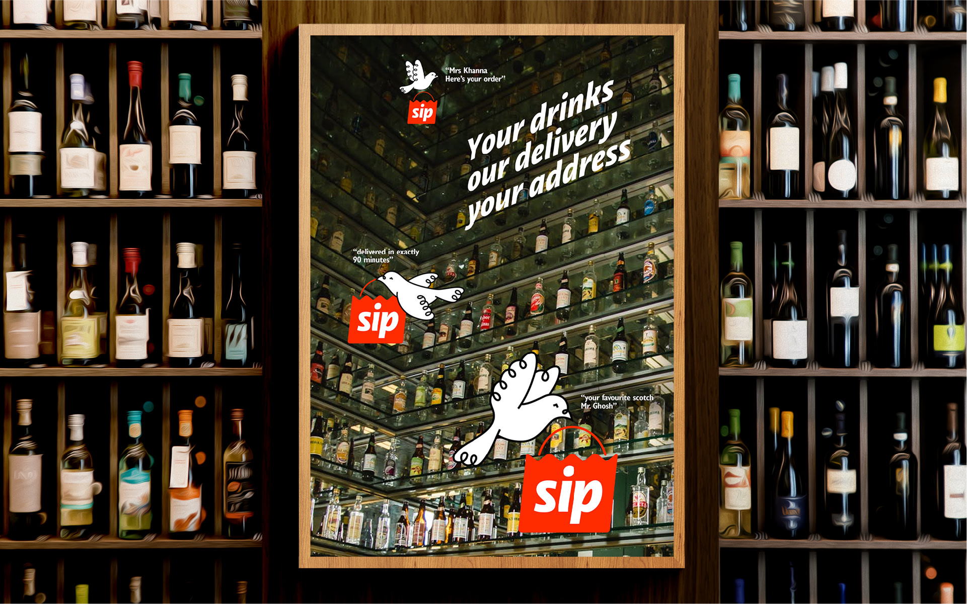 Sip, an AlcoBev delivery platform will deliver alcohol of your choice, to your doorsteps across India now. A much awaited business and delivery platform deserved a unique and celebratory brand idea and approach. ICD creates a memorable, distinct and a delightful brand position, to catch the troubled consumer’s (alcohol shopping = woe in India) attention. Shop—ship—sip, now always in peace!