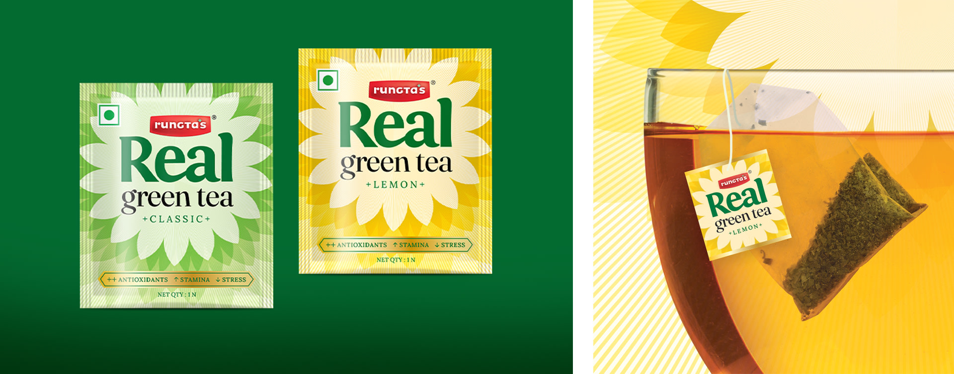 The Rungta Company, maker of mass market tea blends, is introducing its first green tea offering—Real Green Tea, as part of its ‘Real’ range, a budget friendly offering. We were asked to design the pack for the launch of this new variant.
