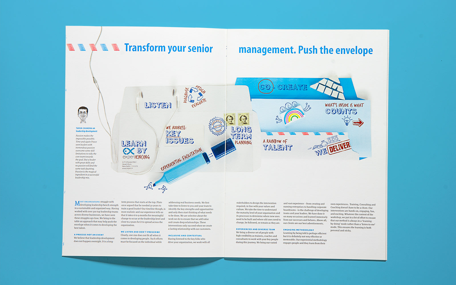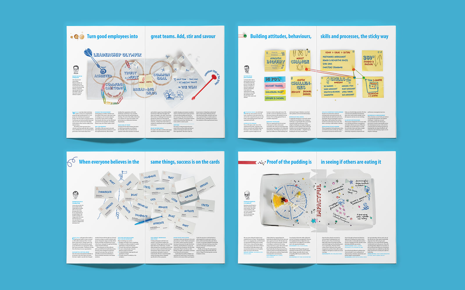 The brochure lays out the new value proposition and product offering. It goes deep into the subject of team functioning, using stationery from the office desk as vehicles for handwritten text. Dispensing with the authoritative tone beloved of consultants, preferring a human, non-academic and a sleeves-rolled-up attitude to work.