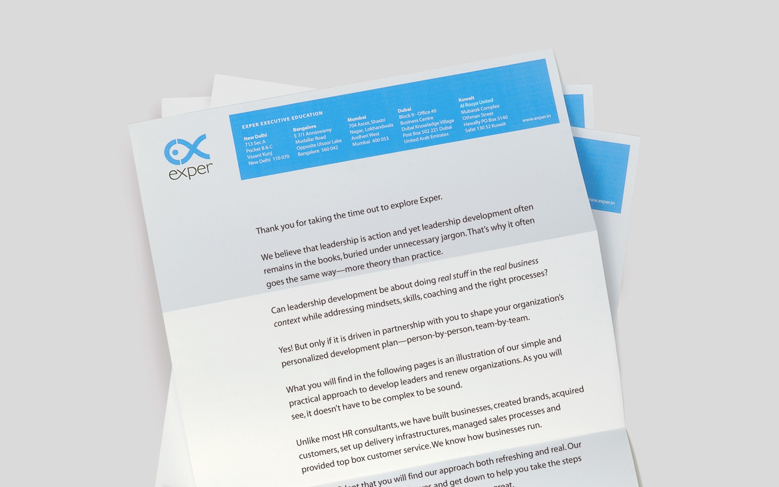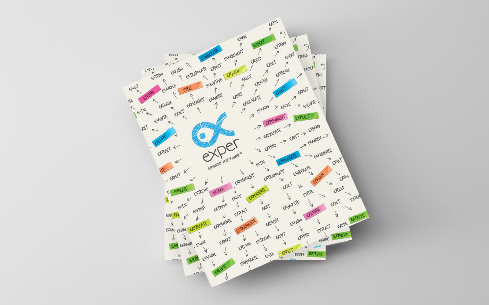 We developed the name Exper. It’s a word fragment common to many words: expertise and experience being among them. The line “Experience Performance” captures the proposition. Phonetically, its short length and vowel ending give it the lightness of touch that’s in keeping with the training style espoused by the client.