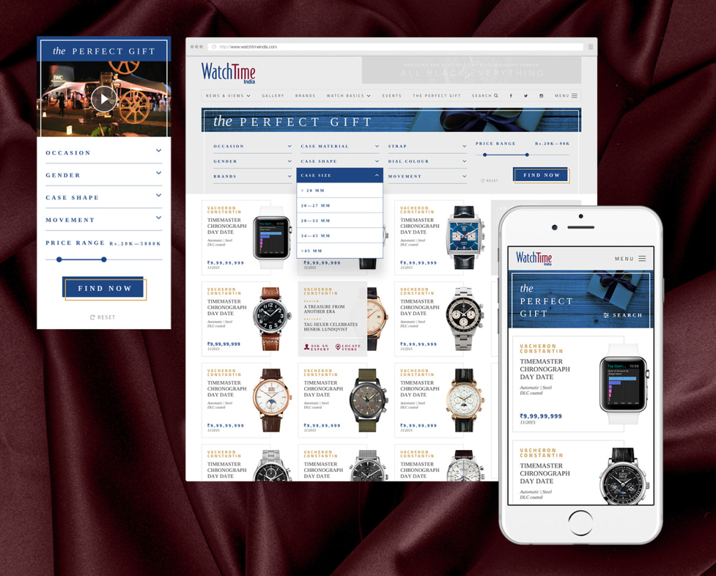 Visually led conversation, steered by powerful photography for the well-read, well-travelled loyalists. We introduced a gifting section called “the perfect gift”. One could journey through myriad brands, seek expert reviews or locate a nearby store—a page that answers all brand questions for a memorable experience of finding the ‘one’ for you.