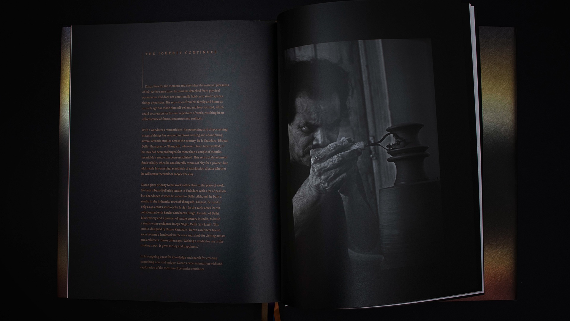 PR Daroz is one of India’s foremost ceramic artists. His diverse oeuvre over 50 years—pots, sculptures, architectural installations—covers a large body of work. His pieces and architectural installations adorn important public spaces, hotels and corporate offices of major companies across the country. We were approached to design a book to document and exhibit PR Daroz’s life in ceramic art.