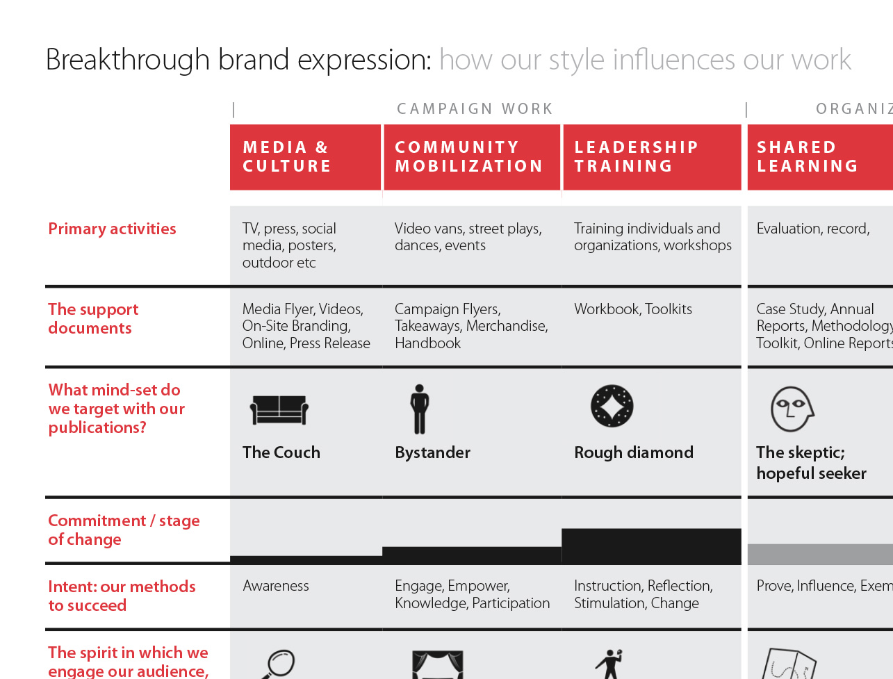 Breakthrough’s visual branding had been defined but failed to carry on to the publications. Without it, Breakthrough couldn’t harvest the credit for its campaigns, which were better known than the organisation itself. At another level, the communications weren’t always effective, as the understanding of audiences and objectives, language, tonality and messaging were not in place.