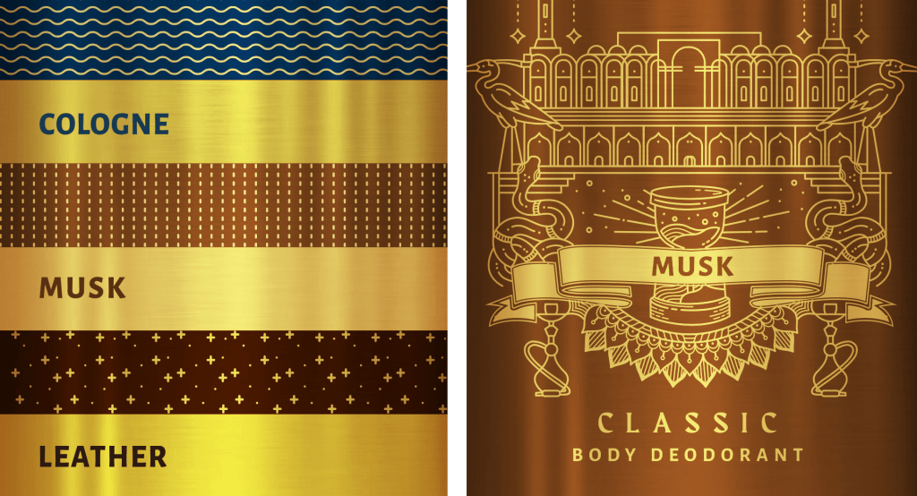 Illustrations on each pack depict scenery and artefacts from a specific time and place in history—Cologne is placed in Victorian Europe. Leather is set in the wild American west. Musk finds a home in the golden Asian age.