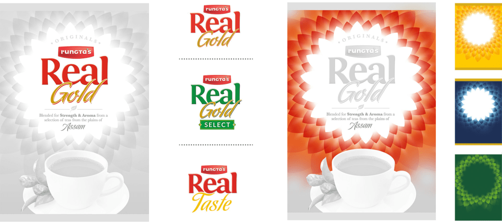 The first step was an architecture to accommodate a wide range of tea blends. The ‘Rungta’ identity is credited as a provider of quality foods. Under the Rungta’s banner, the existing tea brand Real offers specific varieties of products, which have qualities that lend an advantage over generic versions. Variants would be marketed with a focus on their origin.