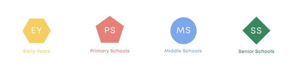 Primary colours gave further meaning and bright character to the pages. Colours and shapes were further used to differentiate their four programmes—Early Years, Primary, Secondary and Senior schools.