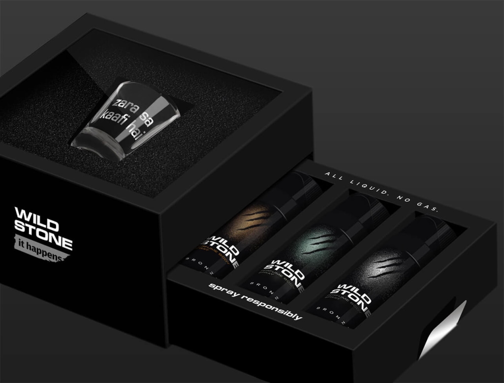 Compressing the brand mark into a small spray and concentrating its power paved way for potency, a value compatible with the Wild Stone brand space. The variants expressed in a range of metals aligning them with Wild Stone’s masculinity.